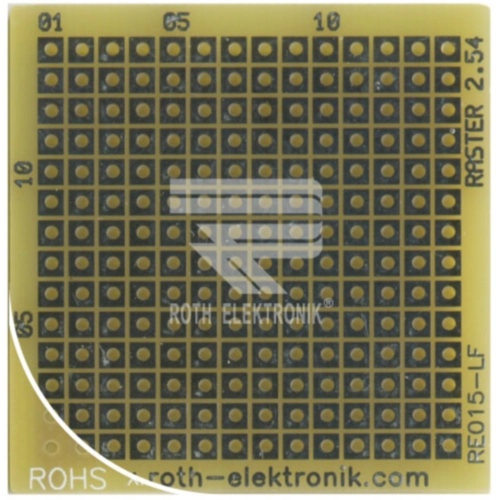 Single-sided 35 µm copper plating; Dimensions: 40 x 40 mm. Substrate: epoxy fiber-glass FR 4. Surface: HAL lead-free. Board thickness: 1.5 mm. Perforation layout: 14 x 14 solder pads. Solder pad diameter: 2.0 x 2.0 mm. Perforation diameter: 1.0 mm. Grid: 2.54 x 2.54 mm.