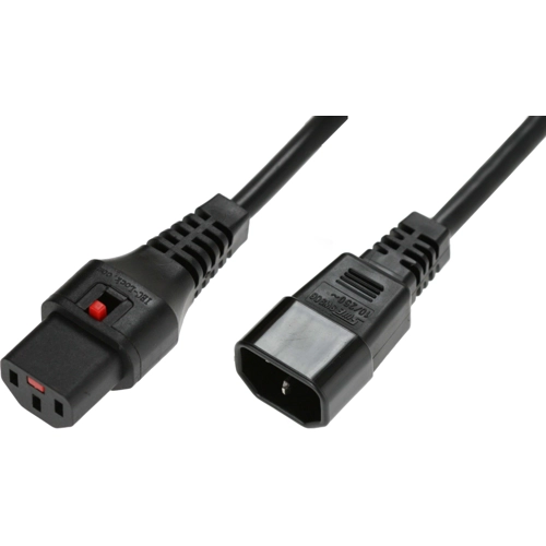 IEC cable assembly with locking system for IEC C14 inlet. The locking system has a tensile force of typical 200N. Schaffner power cord with IEC lock guard against accidental disconnection of all electrical appliances with an IEC inlet.