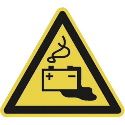 Symbol for: Warning of Danger by Charging of Batteries. Suitable for indoor and outdoor bonding, to DIN EN ISO 7010-W026, ASR A1.3 W026. Material: glossy self-adhesive plastic foil. Side length: 100 mm. Material thickness: 0.08 to 0.1 mm. Thermal resistance: –30 to +70°C. Bonding temperature: above +8.0 °C.