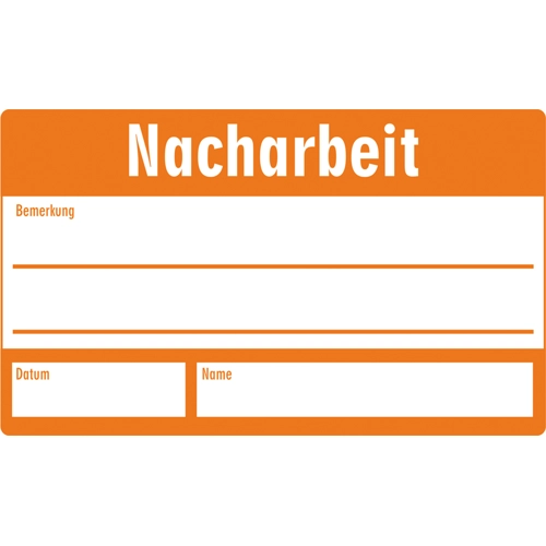 Quality assurance sign, text: Nacharbeit", (W) 50 mm, aluminum, 088.54-9-30X50-A, package with 5 pieces