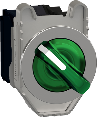 This flush mounted illuminated selector switch is a part of the Harmony XB4 metallic range and is a complete product. It has a mounting diameter of 30.5 mm. The rated supply voltage is 110 V to 120 V AC. The source of light is an integral LED. Customized marking option through web customization tool is available in Schneider Electric website. The flush mount design of this selector switch addresses the market demands for ergonomic and aesthetics. It has a green standard handle with 3 positions ± 45 degree stay put. The contact type is 1NO and 1NC slow break and the connection terminal is screw clamp. The shape of the head is round. The bezel is chromium plated and the fixing collar is zamak. The weight of this selector switch is 151 grams, height is 53 mm, and width is 36.6 mm. The simplicity of installation, flexibility, and robustness makes it suitable for the majority of industrial segments and applications. With IP66, 67, 69, and 69K, type 12, 13, 4, and 4X, IK06, protection against solid objects, dust, water, and high impact is achieved. It is certified with EN/IEC, CE marking, UL, CSA, CCC, EAC, JIS, and marine approvals. To name a few, flush mounted metal circular blanking plug, metal ring, spacer, protective washer, and flush mounting kit are some of the dedicated accessories to be ordered separately, available to facilitate the installation. The packaging includes 1 unit of this selector switch. It can be easily installed to a panel cut out with the help of a cross head screwdriver. Contacts and heads are designed to prevent vibration, helping to ensure secure mounting and wiring. It is eco-friendly and complies with directives such as RoHS, WEEE, etc. related to environmental protection.
