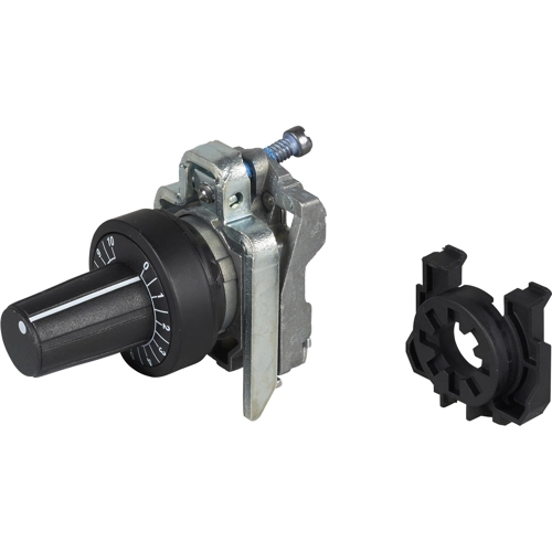 This Harmony XB4, head and mounting base is used for potentiometer application. This head and mounting base for potentiometer provides an ergonomic external interface for controlling your machines thanks to its knurled knob head. It is ideal for controlling key parameters of automation components like drives and inverters and is easily installed and replaced on compatible potentiometers. It is impact resistant, dust resistant, water resistant and vibration resistant thanks to its IP65. It has a metal bezel, this makes it Ideal for applications requiring high impact and vibration resistance. It is designed to fit in a standard 22 mm cutout, ensuring compatibility when installing in pre-existing machinery. Its wide range of operating temperatures from -40°C to 70°C allows versatility in usage of product.