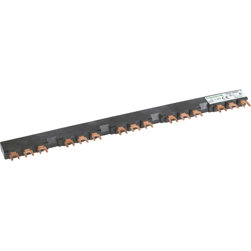 TeSys GV busbar set, 3 phases, 63 A/690 V, for the upstream parallel wiring of groups of motor starters composed of GV2 motor circuit breakers or LS1D32 fuse carriers. For use with screw clamp terminal devices, it is composed of 5 tap-off outlets for the paralleling of 5 devices with a pitch of 54mm. The use of a terminal block GV1G09 or GV2G05 is recommended to supply the busbar sets (to be ordered separately). Green Premium compliant (RoHS/REACh).