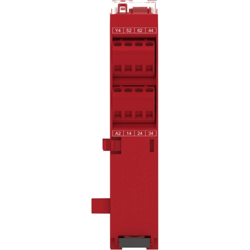 This safety relay is designed for extending the number of safety contacts. The safety relay is powered with 48-240V AC/DC, and equipped with a screw removable terminal block. This universal safety module embeds pre-defined safety functions, or selectable safety functions via rotary selectors. This safety relay embeds a safety extension bus, 4 NO and 2 single NC safety outputs. The maximum safety level achieved by this safety relay is PLe/Category 4 conforming to ISO 13849-1, SILCL 3 conforming to IEC 62061, SIL 3 conforming to IEC 61508.