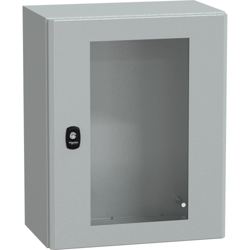 Spacial S3D steel wall-mounting enclosure for multi-purpose applications is designed for use in harsh environments. It can withstand high impact due to its IK08 (IEC62262) rating and has a high resistance to dust and water with an IP66 rating (IEC60529). This enclosure has a nominal height, width and depth of 500 mm, 400 mm and 250 mm, respectively the enclosure is grey-coloured (RAL-7035) with an epoxy-polyester powder surface finish. The enclosure consists of a body, a glazed door, a lock and a cable gland plate the door can be opened up to 120°, allowing easy access to the equipment inside furthermore, it is possible to change the opening side of the door (reversible).