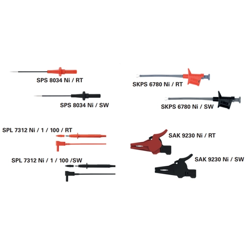1 safety test probe and 1 safety lamella-basket angle plug, assembled on highly flexible double-insulated PVC cable 1 mm², including tip protection cap.