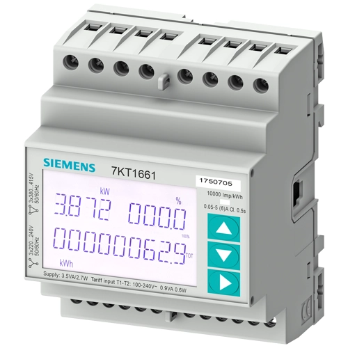 SENTRON, measuring device, 7KT PAC1600, LCD, L-L: 400 V, L-N: 230 V, 5 A, strd rail instr., 3-phase, S0 + MID, apparent/ active/reactive energy, self-powered, screw terminals Energy counter SENTRON 7KT PAC1600 for calibrated measurement of the power consumption in single-phase and three-phase systems, e.g. in industrial plants, commercial buildings, offices and apartments in apartment blocks, for billing purposes. The 7KT PAC1600 energy meters calibrated according to MID enable precise, reproducible, and reliable measurement of energy values for infeed, outgoing feeders or individual loads via transformer measurement or direct measurement up to 80 A (3-phase) and up to 63 A (1-phase). They not only provide comprehensive information about your electrical installations and power distribution, but also key measured values for assessing the status of the plant. For further processing of the measured data, the devices are equipped with a wide range of communication options for easy integration into higher-level automation and energy management systems via Modbus RTU, M-Bus or S0 interface. The 7KT PAC energy meters are available in different versions designed to match your requirements. SENTRON PAC - specialists in measured value acquisition.
