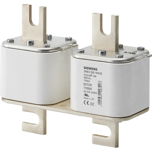 SITOR fuse link, with slotted blade contacts, 2 x NH3, In: 1100 A, gR, Un AC: 690 V, front indicator SITOR 3NE and 3NC semiconductor fuses protect power semiconductors from the effects of short circuits. As an important element of the SENTRON protective component line for electronic installations, the SITOR fuse system from Siemens provides effective protection for personnel, equipment and plants with reliable shutdown in the event of an overload or short circuit. The area of application also includes frequency converters with fuses in the input circuit and in the DC link and also UPS systems and soft-starters for motors.