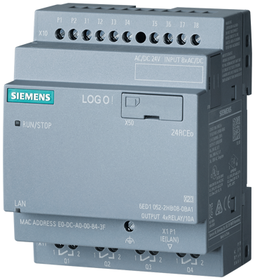 LOGO! 24RCEO (AC), logic module, PS/I/O: DC 24V/24V AC/relay, 8 DI/4 DQ, without display, memory 400 blocks, modular expandable, Ethernet, integrated web server, data log, user-defined web pages, standard microSD card for LOGO! Soft Comfort V8.3 or higher, older projects executable cloud connection in all LOGO! 8.3 basic units The LOGO! 8 basic units with their 8 digital inputs and 4 digital outputs and an installation width of just 72 mm integrate a host of familiar functions (current impulse relay, automatic staircase timer, contactor relay, time relay, etc.) which can be combined with one another in many different ways. Switching programs can be created and simulated easily on the PC. Depending on the integrated Ethernet interface, communication between as many as nine LOGO! 8 modules or SIMATIC S7 systems is possible. The web server is also integrated and can be used to monitor and control connected loads over WLAN or Internet. Users can design web pages themselves, even without knowledge of HTML. GSM or GPS communication as well as integration in KNX building management systems is possible using additional modules. LOGO! 8 basic units are available with and without displays for different input voltages as well as with transistor or relay outputs (up to 10 A rating). Can be expanded with additional modules for up to 24 DI / 20DQ (8 AI / 8 AQ). Cloud communication integrated. LOGO! 8 can also be expanded with an external text display for clearly visible messages in plain text. The color of the backlit display can be selected for optical highlighting. A variety of LOGO! power modules are also available for power supply.
