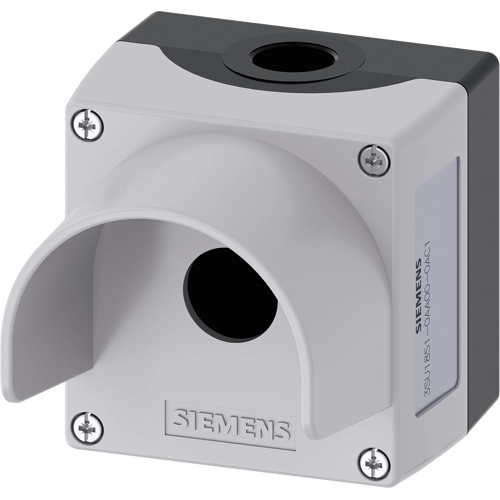 Enclosure for command devices, 22 mm, round, Enclosure material metal, enclosure top part gray, with protective collar, 1 control point, without equipment, floor mounting, 1xM20 each on top and bottom Enclosures SIRIUS ACT for mounting the 22.5 mm pushbuttons and indicator lights for separately allocated control units and cabinets. An innovative snap-on concept makes the task of installing a unit so easy that it can be done with one hand and without any special tools. Groove-free holes are adequate as mounting holes since full twist prevention is already integrated. Thanks to the high degree of protection throughout, the rugged devices are suitable for use in industry and outdoors. Even cleaning with a high-pressure jet is possible. Neither dust, oils, nor caustic solutions can interfere with reliable operation. As well as standard wiring, the devices can also be connected to the controller via PROFINET, AS-Interface or IO-Link. Doing so will help you to reduce wiring time and effort, minimize error sources and have more flexibility. The graphical Online Configurator provides convenient support when selecting and ordering individual devices, enclosures and labels. SIRIUS ACT - Performance in action for control and signalling. Simply mounted, simply strong, simply perfect.