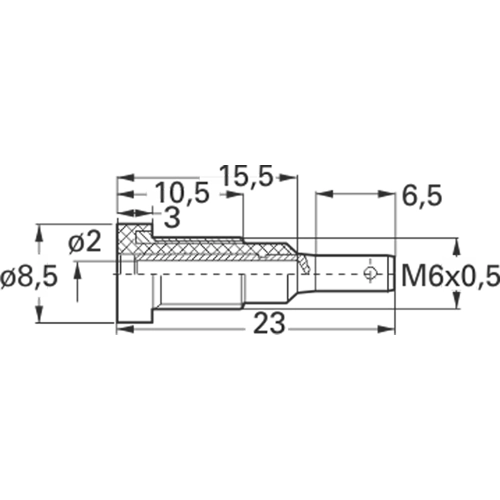 Insulated, Ø 2 mm rigid socket. Machined brass. Metal thread jacket on the insulation. The socket can be screw-mounted in predrilled panels. Flat connecting tab 2.8 mm x 0.8 mm.