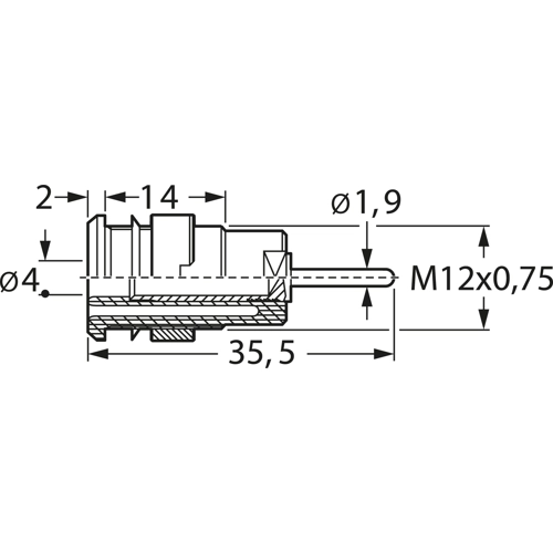Insulated, rigid, Ø 4 mm, accepting spring-loaded Ø 4 mm plugs with rigid insulating sleeve. Machined brass. The socket is screwed into pre-drilled panels of plastic, metal, etc. Connection: Round connecting pin Ø 1.9 mm.