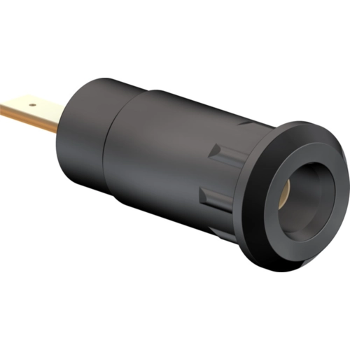 Insulated, rigid, accepting spring-loaded Ø 2 mm plugs with rigid insulating sleeve. The socket is pressed into pre-drilled panels of plastic, metal, etc. Connection: Flat connecting tab 2.8 mm x 0.8 mm.