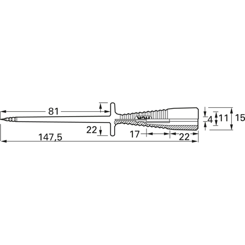 Test probe with sharply pointed stainless steel tip, e.g. for piercing insulation and paint. Ø 4 mm rigid socket in handle accepting spring-loaded Ø 4 mm plugs with rigid insulating sleeve. For increased safety the Ø 4 mm rigid socket of HP-150/A is sunk into the handle, accepting in-line Ø 4 mm plugs. Supplied with protective cap.