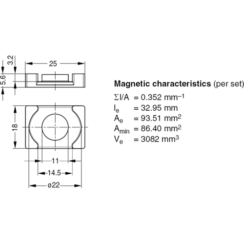 EQ core, N92, 3650 nH, ±25 %, outer Ø 22 mm, inner Ø 11 mm, (L x W x H) 25 x 18 x 5.6 mm, B66481G0000X192