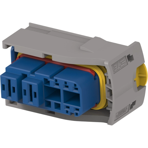 Connector & housing type: housing for female terminals, Connector system: wire-to-board, wire-to-device, Sealable: yes, Hybrid connector: yes, Primary locking feature: on the terminal, Blank cavity position: 3, Number of positions: 10, Number of rows: 2, Operating voltage: 24 VDC, Nominal voltage architecture: 12 V, 24 V, Body material: PA GF, Primary product color: blue, Mating tab width: 1.2 mm, 4.8 mm, 5.8 mm, 6.3 mm, Mating alignment type: polarized, Centerline (pitch): 4-Row-to-row spacing: 6 mm, Operating temperature (max): 70 °C, 75 °C, 80 °C, 85 °C, 90 °C, 100 °C, 105 °C, Operating temperature range: -40-105 °C, Circuit application: power & signal, UL flammability rating: UL 94V-0, Serviceable: no, Connector position assurance capable: yes