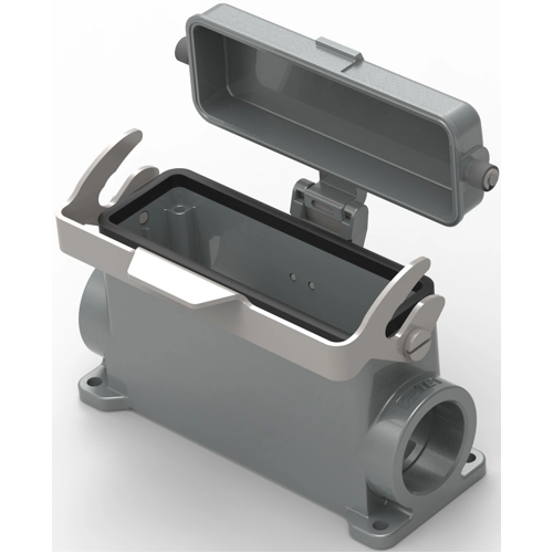 Heavy duty connector base housing, Side entry, Locking clip, Sealable.