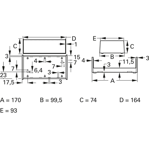 Technical attributes (type, outer dimensions): Wall 4.9, A 170, B 99.5, C 74, D 164, E 93 mm.