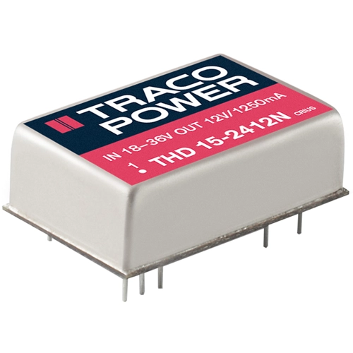 The THD-15N series models provide 15 Watt output power out of a very compact shielded metal case that occupies only 1 inch² of board space. The converters work with a high efficiency over the full load range and draw a very low input current at no load conditions. All models have a wide 2:1 input voltage range and a precisely regulated output voltage. Typical applications for these converters are mobile equipment, instrumentation, distributed power architectures in communication and industrial electronics and everywhere where space on PCB is critical