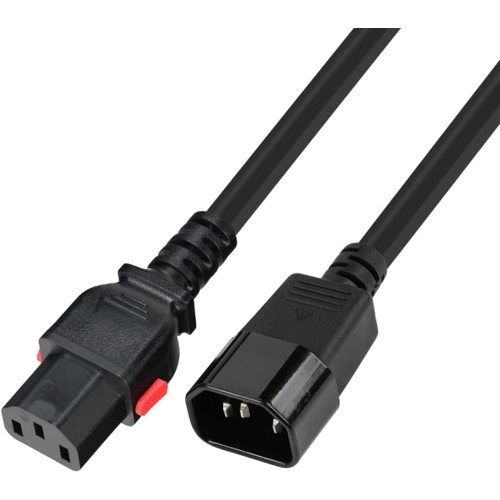The power cable extension from C13 (180°) to C14 (180°) ensures a safe and reliable power supply for IT devices in data centers and offices. The integrated release mechanism prevents accidental disconnection and ensures maximum operational safety. The C13 plug with lock provides a secure hold and minimizes contact problems. Robust workmanship makes the cable ideal for professional use.