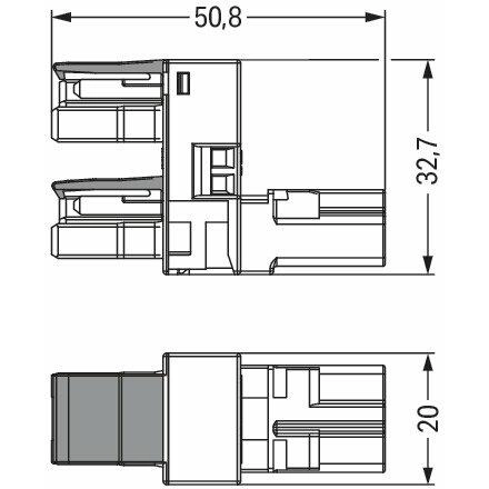 H-distribution connector, 2-pole, code A, 1 input, 2 outputs, outputs on one side, 2 locking levers, white.