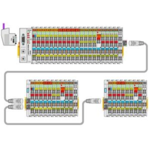 The 750-627 End Module for Internal Data Bus Extension is snapped onto the DIN-rail at the end of the module assembly like the standard 750-600 End Module. The assembly is terminated with the module, to which a connecting cable can be attached with an RJ-45 connector. Power to the internal electronics is supplied via internal data bus. One end module and at least one 750-628 Coupler Module for Internal Data Bus Extension are an operative unit. The fieldbus coupler/controller performs all diagnostic and commissioning tasks.