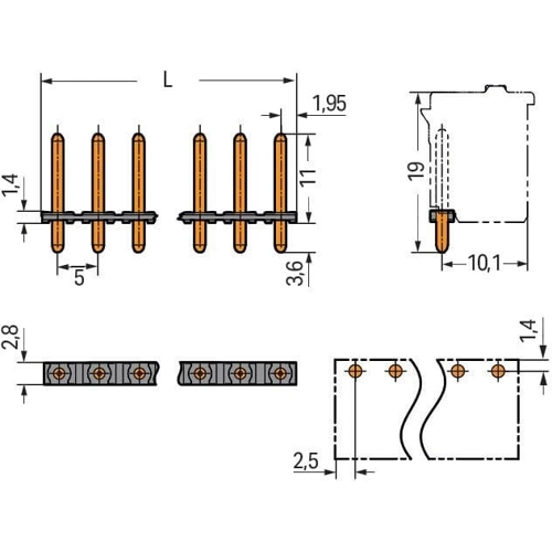 THT male header, 1.4 mm Ø solder pin, straight, Pin spacing 5 mm, 6-pole, black.
