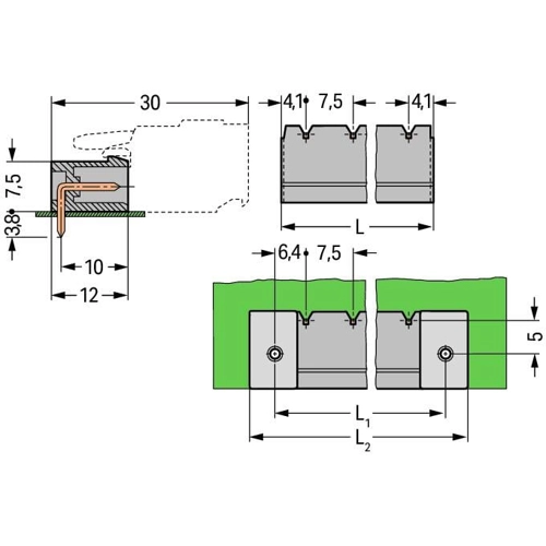 THT male header, 1.0 x 1.0 mm solder pin, angled, Pin spacing 7.5 mm, 6-pole, Gray.