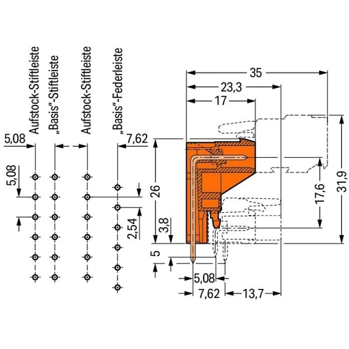 Stackable pinheader with angled solder pins 3-pin Spacing 5.08 mm / 0.2 in with side walls mating direction parallel to PCB orange
