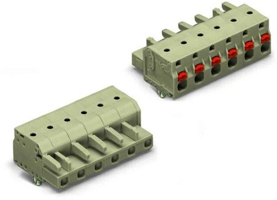 Female connector with actuating pushers and latching feet 2-pole Spacing 7.5 mm / 0.295 in 100 % mismating protected codable only 1 latching nose with mounting adapter 209-137 also on TS 35 Sheet thickness 0.6x1.2 mm Mounting holes Ø 3.5 mm light gray