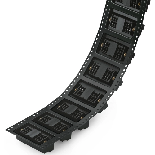 Male connector with straight solder pins and threaded flanges in tape acc. to IEC 60286-3 6x2 poles 2-row solder pin straight 0,8 x 0,8 mm grid spacing 3,5 mm / 0.138 in 100 % mismating protected mating direction perpendicular to PCB black