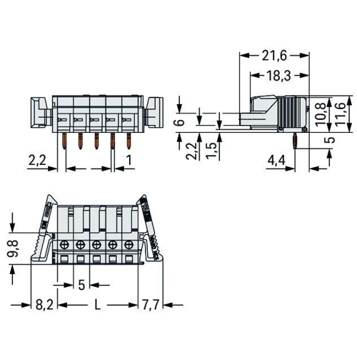 Female connector with angled solder pins and locking pawls 8-pin Spacing 5 mm / 0.197 in 100 % mismating protected Solder pin 0.6x1 mm can be coded Mating direction parallel to PCB with 2 locking lugs with coding lug light gray