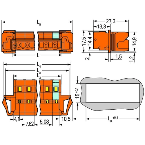 Male connector with snap-in flanges for feed-through applications with sheet thicknesses from 0.5 to 2.5 mm 6-pole Spacing 7.62 mm / 0.3 in orange
