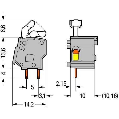 Bayable single terminal block with actuating lever handle 2 solder pins/pole 1-pole grid dimension 10/10.16 mm / 0.4 in lever handle angled orange