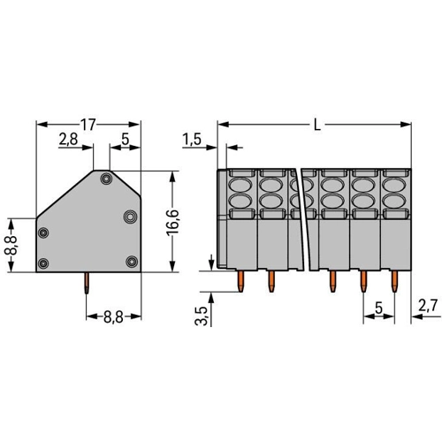 2-conductor PCB terminal block, 1.5 mm², pin spacing: 5 mm, 2-pole, push-in CAGE CLAMP, 1.50 mm², gray.