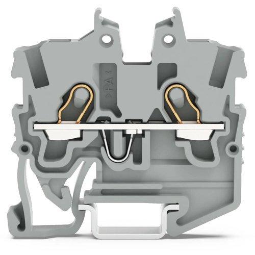 2-conductor mini feed-through terminal block, with actuation opening; 1 mm², with test opening, lateral and central labeling, for mounting rail 15, Push-in CAGE CLAMP®, gray.