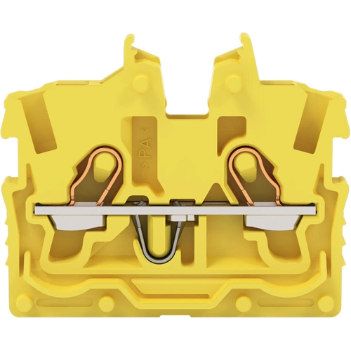 2-conductor miniature through terminal block with operating slots, 1 mm², Center terminal block without snap-in mounting foot, without mounting flange, side and center marking with test port, Push-in, yellow.