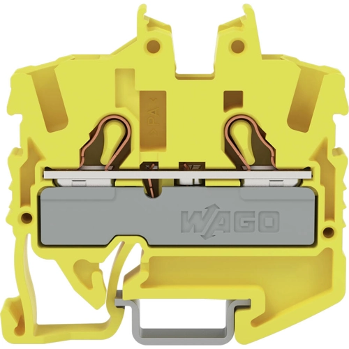 2-conductor miniature through terminal block with operating slots, 2.5 mm², side and center marking with test port, for DIN-15 rail, Push-in, yellow.