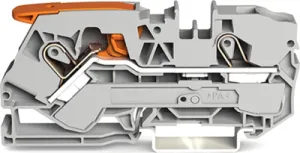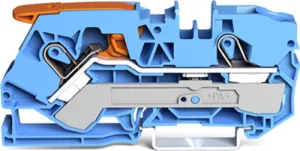 This through terminal block is suitable for conductor cross sections ranging from 0.5 mm² to 16 mm². It features one level and three clamping points for connecting a single potential. The gray housing is made of polyamide (PA66) for insulation. Lever,operating tool is used to operate this through rail-mount terminal block. Our TOPJOB S rail-mount terminal blocks offer more than just secure electrical connections in different industrial applications and modern building installations. They also offer the perfect actuation option for every need: lever, push-button, or operating slot. These through rail-mount terminal blocks are mounted using DIN-35 rails. The front-entry wiring allows you to connect copper conductors. The two jumper slots enable potential distribution to other clamping points.