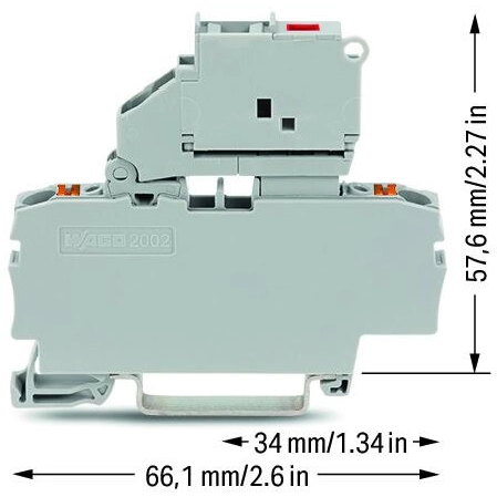 2-conductor fuse terminal block, with pivoting fuse holder, with end plate, for 5 x 20 mm miniature metric fuse, with push-button, with blown fuse indication by LED, 30 - 65 V, for DIN-rail 35 x 15 and 35 x 7.5, 2.5 mm², Push-in CAGE CLAMP, 2,50 mm², gray.