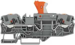 2-conductor disconnect terminal block with pivoting knife disconnect, with test option, orange disconnect link with push-button, for DIN-rail 35 x 15 and 35 x 7.5, 6 mm², Push-in CAGE CLAMP, 6,00 mm², gray.