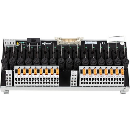 Interface module for system wiring, Pluggable connector per DIN 41651, Male connector, 20-pole, 16-channel relay output, 1 make contact, with disconnect terminal block and fuse, without relay, in mounting carrier.