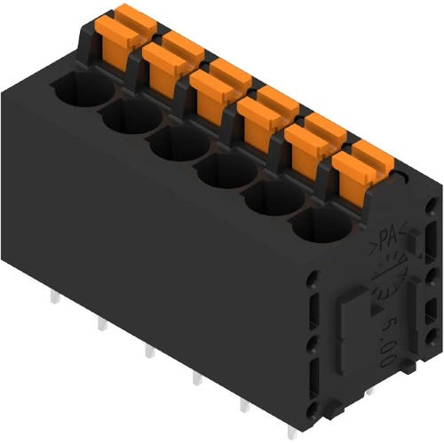 Printed circuit board terminals, 5.00 mm, Number of poles: 6, 180°, Solder pin length (l): 3.5 mm, tinned, black, PUSH IN with actuator, Clamping range, max. : 2.5 mm², Box.
