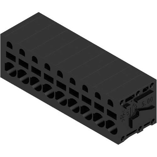 Printed circuit board terminals, 5.00 mm, Number of poles: 9, 90°, Solder pin length (l): 3.5 mm, tinned, black, PUSH IN without actuator, Clamping range, max. : 2.5 mm², Box.