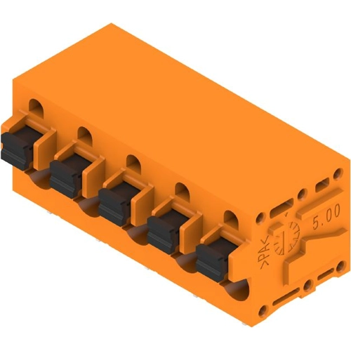 Printed circuit board terminals, 7.50 mm, Number of poles: 5, 90°, Solder pin length (l): 3.5 mm, tinned, orange, PUSH IN with push button, Clamping range, max. : 2.5 mm², Box.