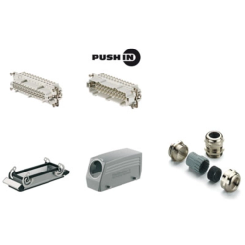 The 1061780000 is a standardized kit for assembling complete plug-in connectors. The HDC kit normally consist of a male insert, a female insert, a plug housing, a bulkhead housing and a cable gland. The PUSH IN connection is a direct-insert method of connection. The preprocessed wire can be inserted directly into the wire connection without the need for any tools.