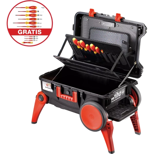 The tool case XXL III from Wiha offers enough storage space coupled with absolute robustness. In addition, it contains especially developed tool storage compartments that offer enough space for the neat storage of a comprehensive tool assortment. Thanks to its extra large wheels it is very easy to conveniently pull the case along on rugged terrain or stairs. The legs can be folded out, turning the case into a slip-proof step. In addition, the raised position allows the comfortable and strain-free removal of the tools. The V-shaped incision with a scale in the lid of the case facilitates the sawing of materials, such as cable ducts, at the construction site. Made of robust polypropylene, the case also features gas-filled shock absorbers, which hold the lid in different positions, preventing it from closing accidentally and smashing fingers.